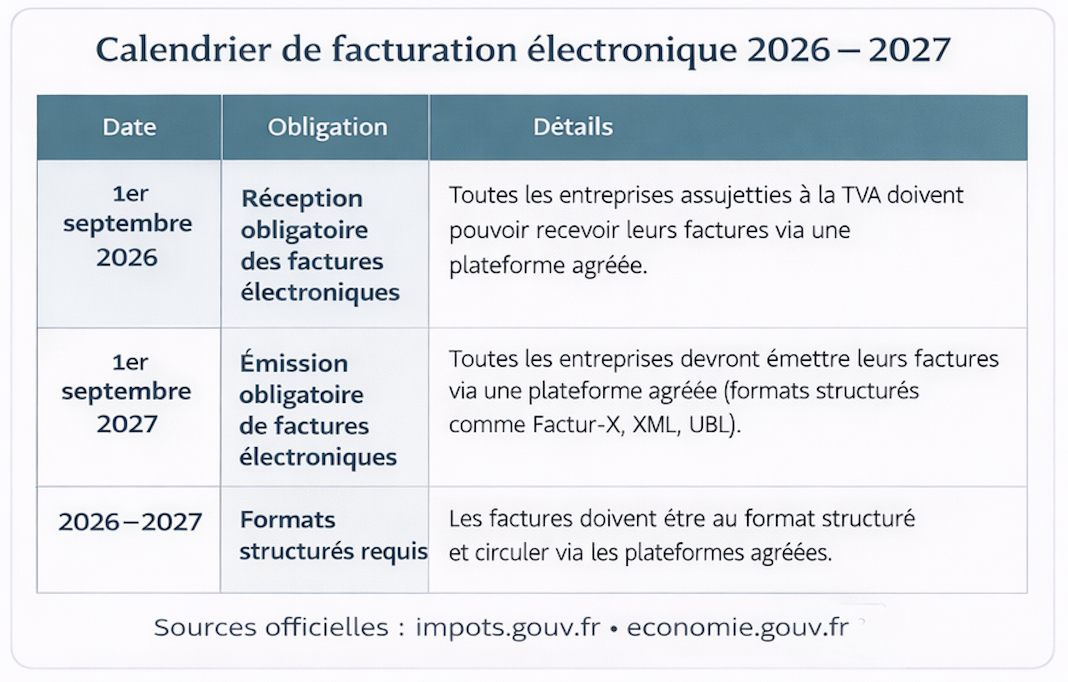 Dès septembre 2026, tous les professionnels assujettis à la TVA devront recevoir leurs factures via une plateforme agréée, puis les émettre au format structurant (comme Factur-X ou XML) à partir de 2027.